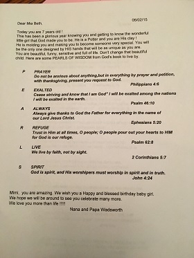 Each of my granddaughters gets 100 pearls. With each pearl they get 6 Bible verses that coordinate with the beginning of the letters ... PEARLS.